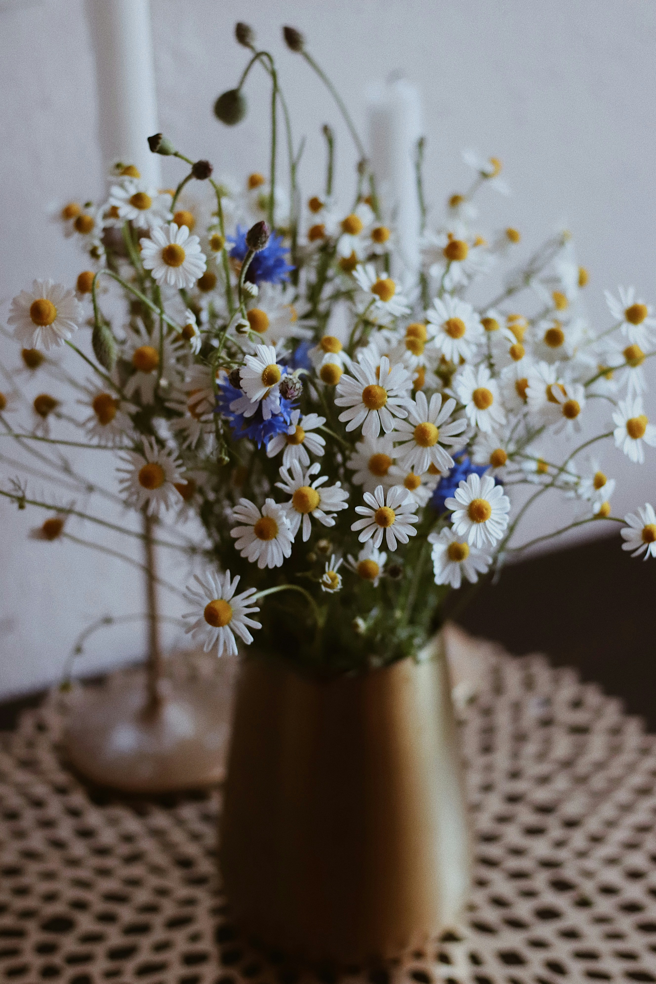 White And Blue Flowers In Brown Ceramic Vase Photo Free Plant