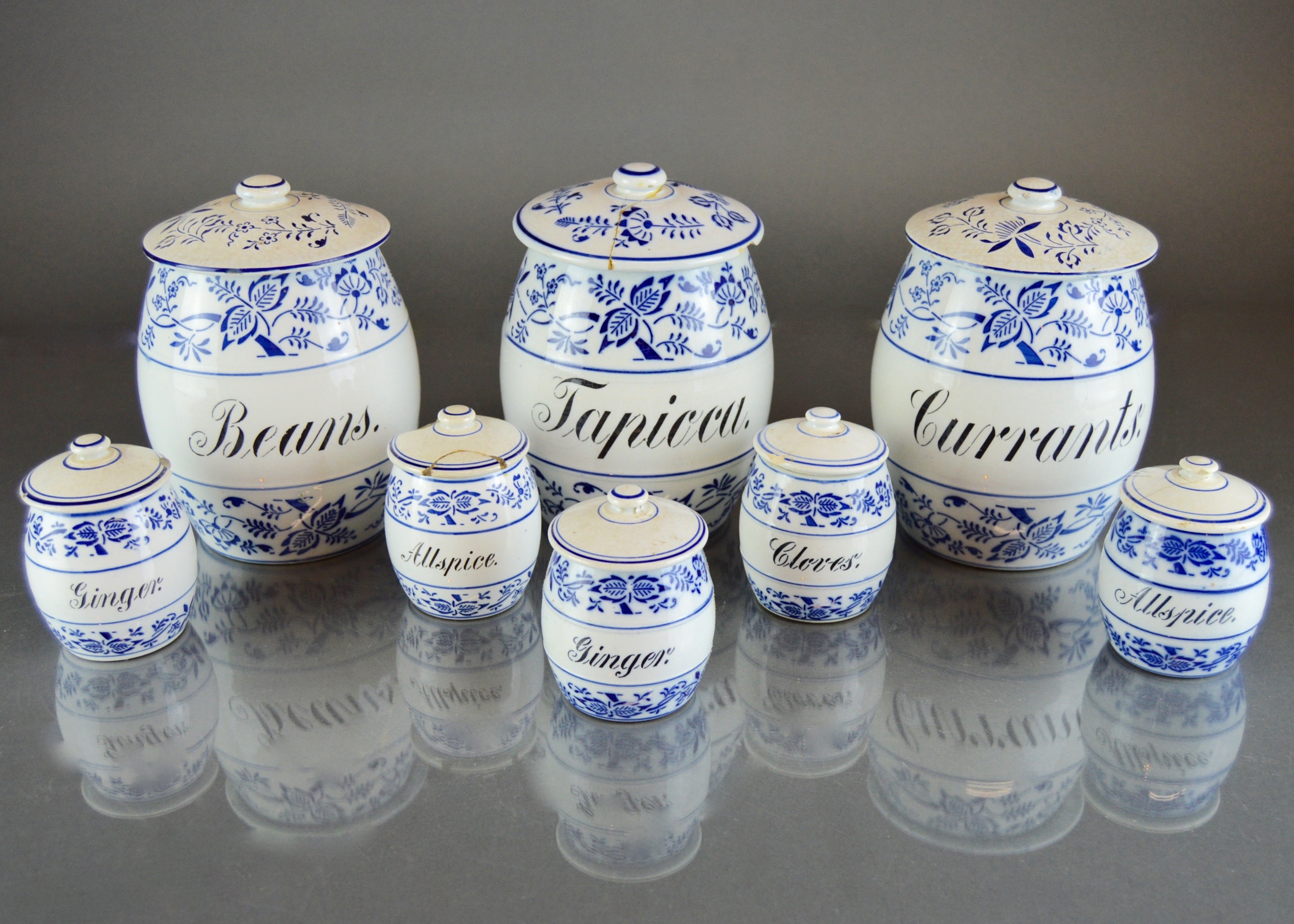 8 Piece German Blue White Footed Windmill Canisters