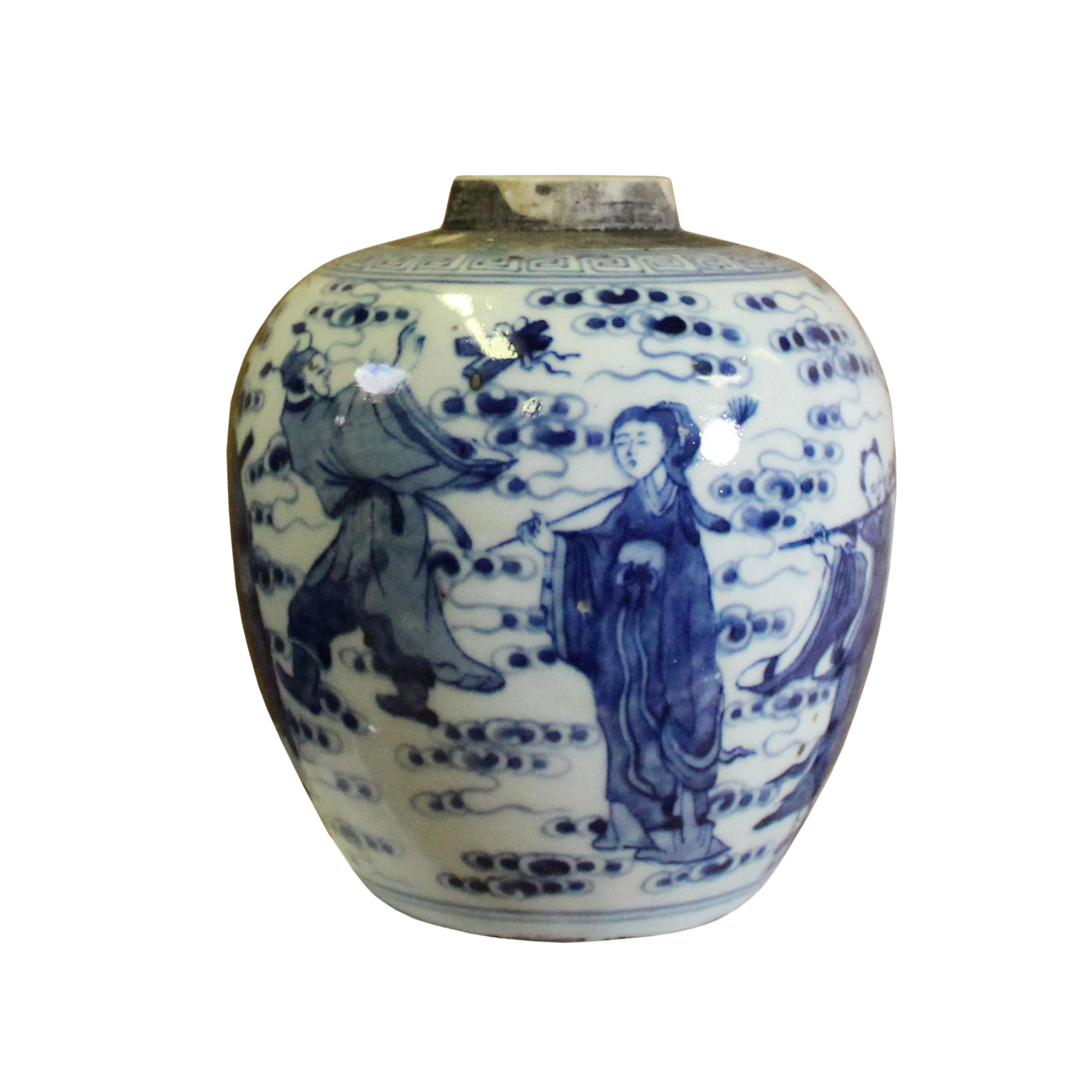 Antique Chinese Blue White Provincial Ming Stoneware Small Ginger Jar Pot Scenic Ebay