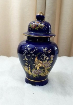 Cobalt Blue Pheasant Peacock Decor Porcelain Ginger Jar 24k Gold