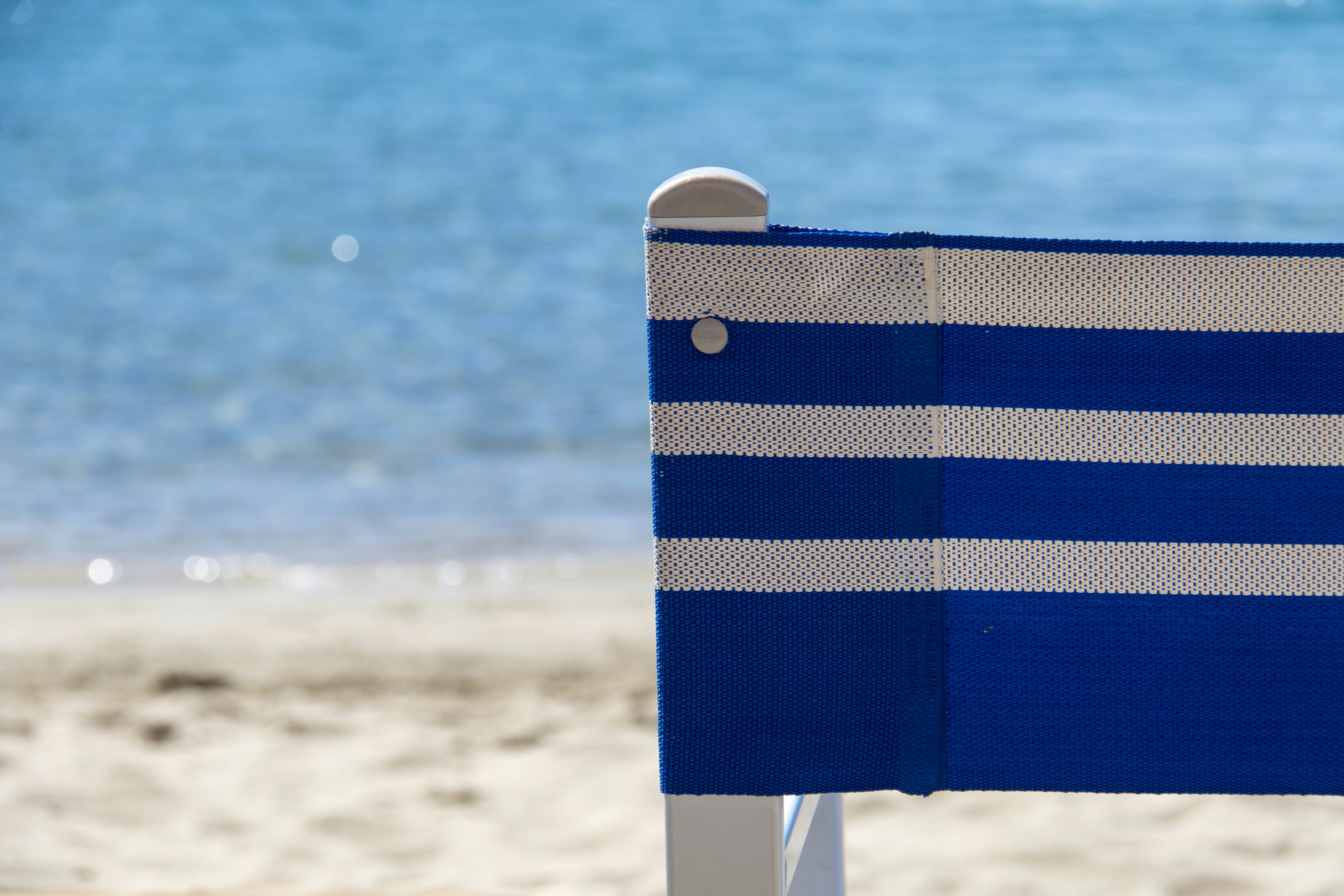 Blue And White Striped Folding Chairs On Beach During Daytime