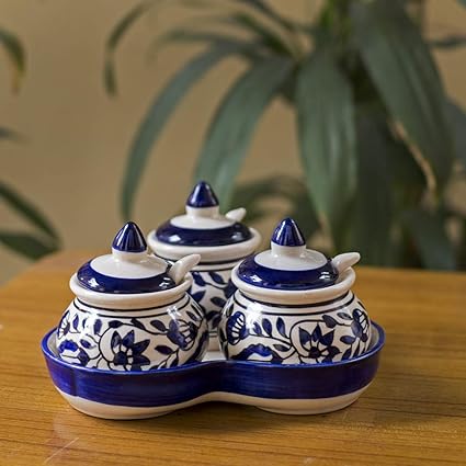 Buy Craftghar Ceramic Pickle Jar With Spoons And Tray Blue Set