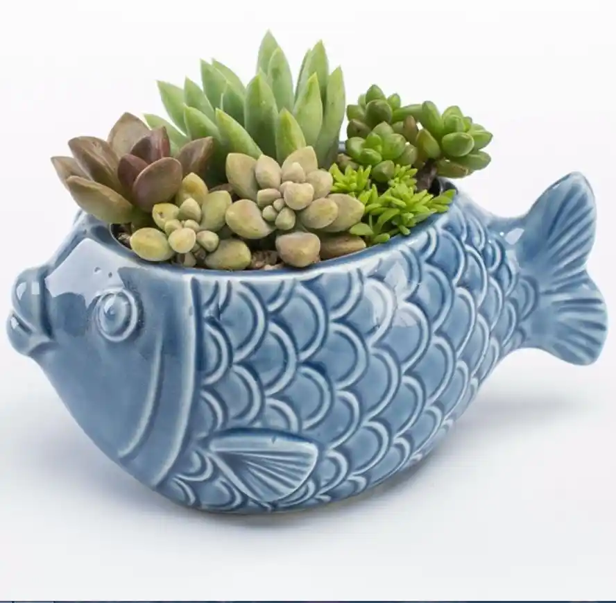 European Style Cute Fleshy Flowerpot Pocelain Blue Fish Flower