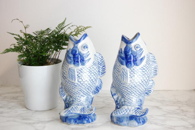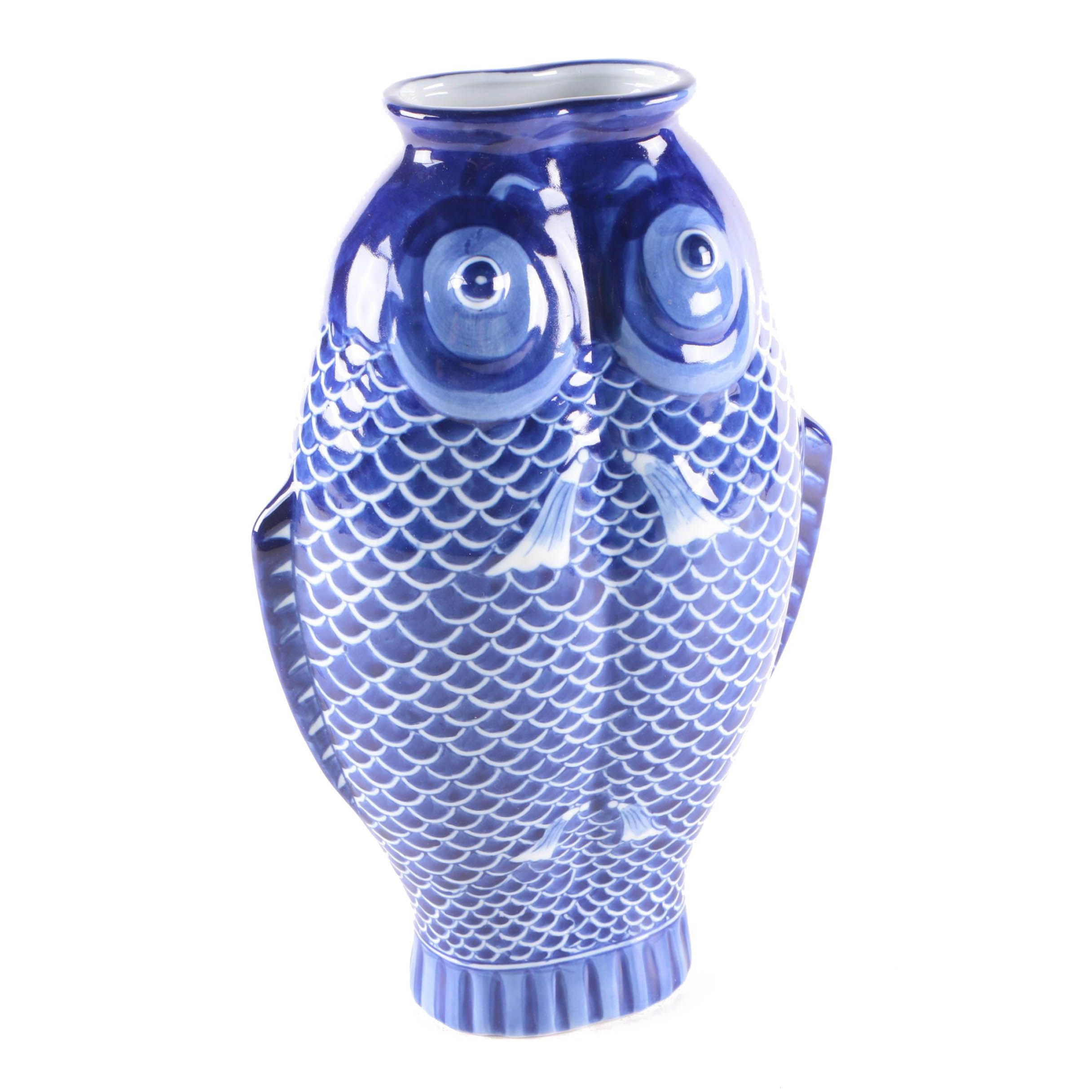 Blue White Ceramic Fish Vase Chinoiserie Coastal Asian Decor By