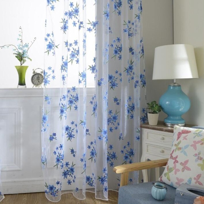 Blue Floral Curtain Green Sheer Semi Blackout Curtains For Living