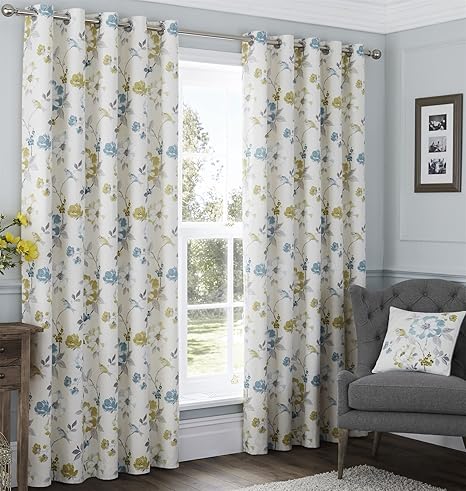 Blue Green Stella Floral 100 Cotton Lined Eyelet Curtains The