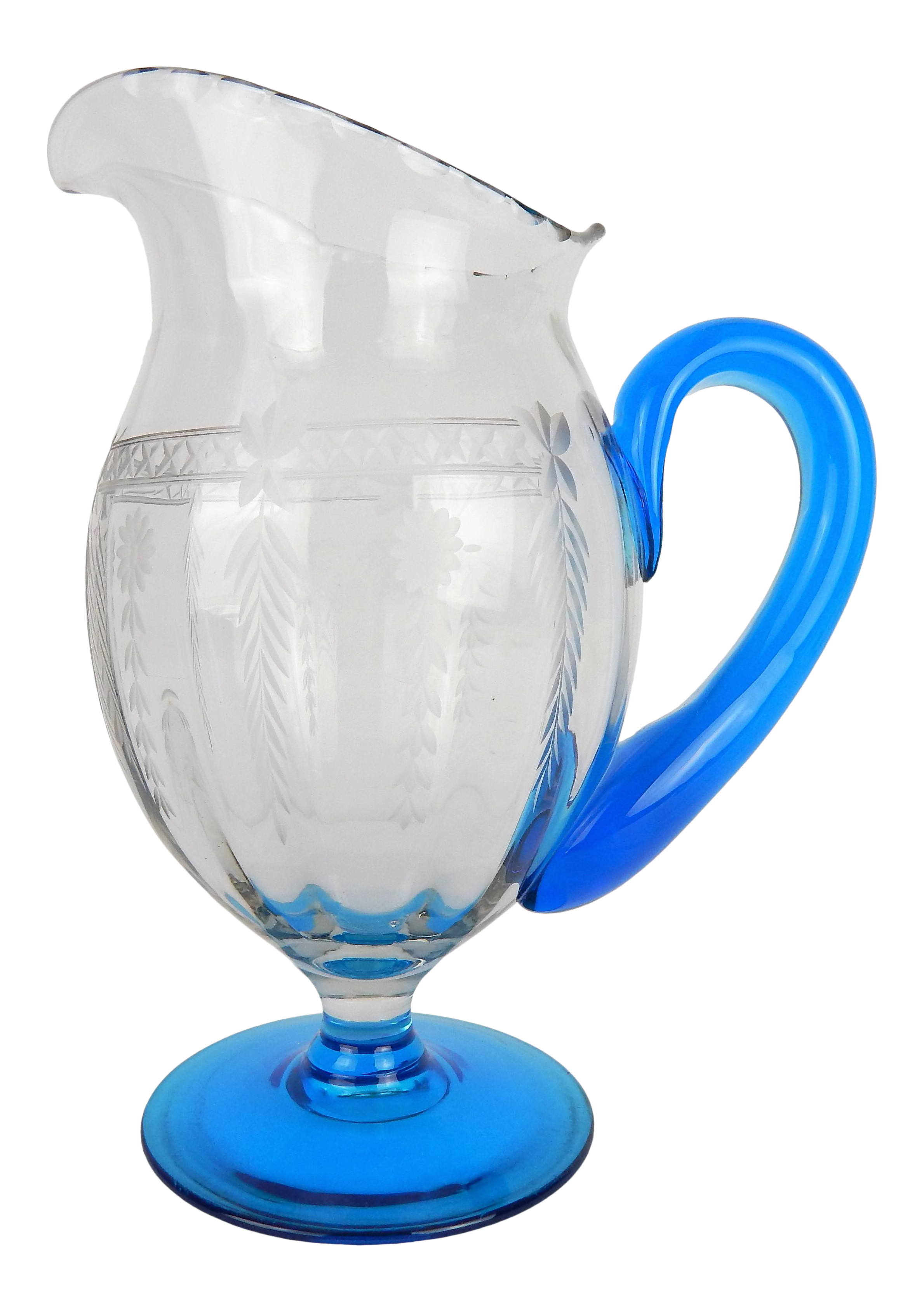 Etched Glass Pitcher With Applied Blue Handle And Foot Chairish