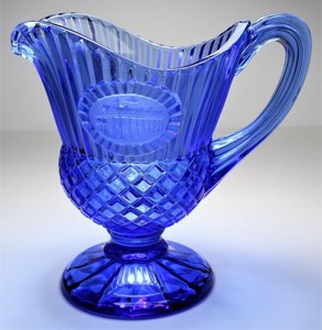 American Pressed Blue Glass Pitcher With Applied Handle Cherries