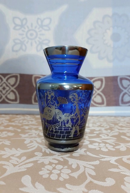Diminutive Cobalt Blue Glass Vase W Hand Painted Silver Overlay Vintage 17 67 Picclick Uk