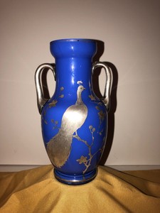 Hand Painted Silver Overlay Blue Glass Vase Ebth