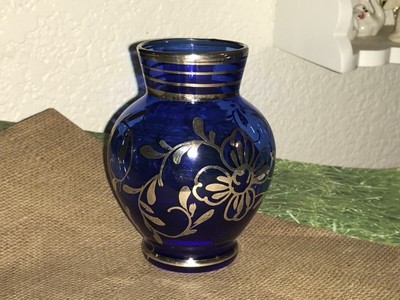 Vintage Small Cobalt Blue Glass Vase With Silver Overlay Hand Blown H 4 75 W 2 Ebay