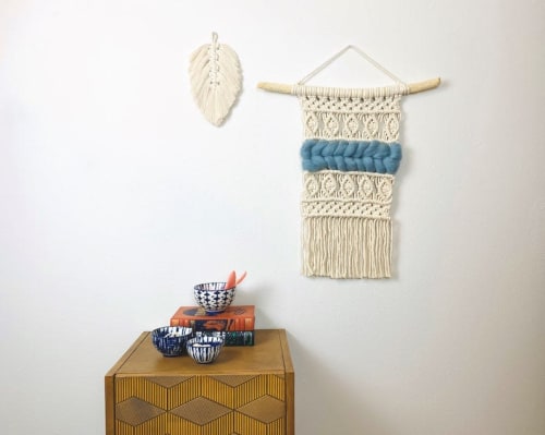 White Macrame Wall Hanging With Chunky Light Blue Wool