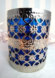Ocean Blue Mercury Glass Candle Holder Silver Filigree Memorial