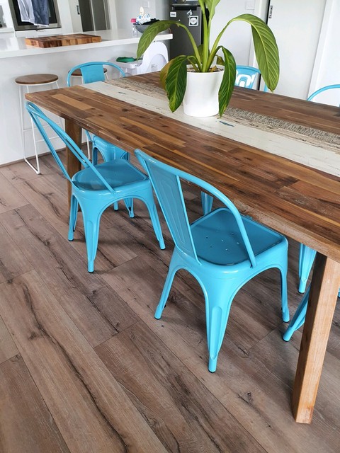 Blue Metal Chairs In Contemporary Neutral Dining Room Dining