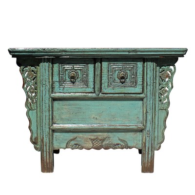 Chinese Vintage 2 Drawers Carving Distressed Gray Blue Side Table