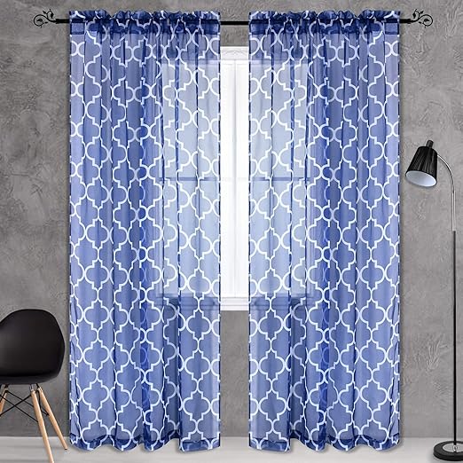 Amazon Com Keqiaosuocai Trellis Blue Sheer Curtains For Bedroom Rod Pocket Moroccan Tile Print Soft Window Draperies Drapes Panels For Nursery 52x84 Rod Pocket Pack Of 2 Home Kitchen