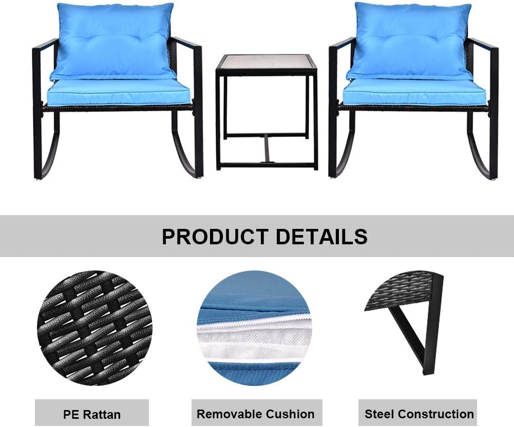 3pcs Patio Wicker Rocking Chair Rattan Rocker Blue Cushion W