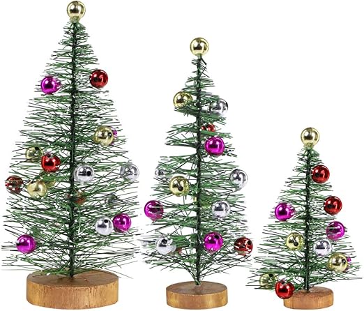 Amazon Com 3 Pack Frosted Green Bottle Brush Trees With Metallic Bead Ornaments Artificial Mini Pine Trees Tabletop Christmas Trees On Wood Stand For Vintage Holiday Decor Winter Miniature Village Assorted Sizes Home