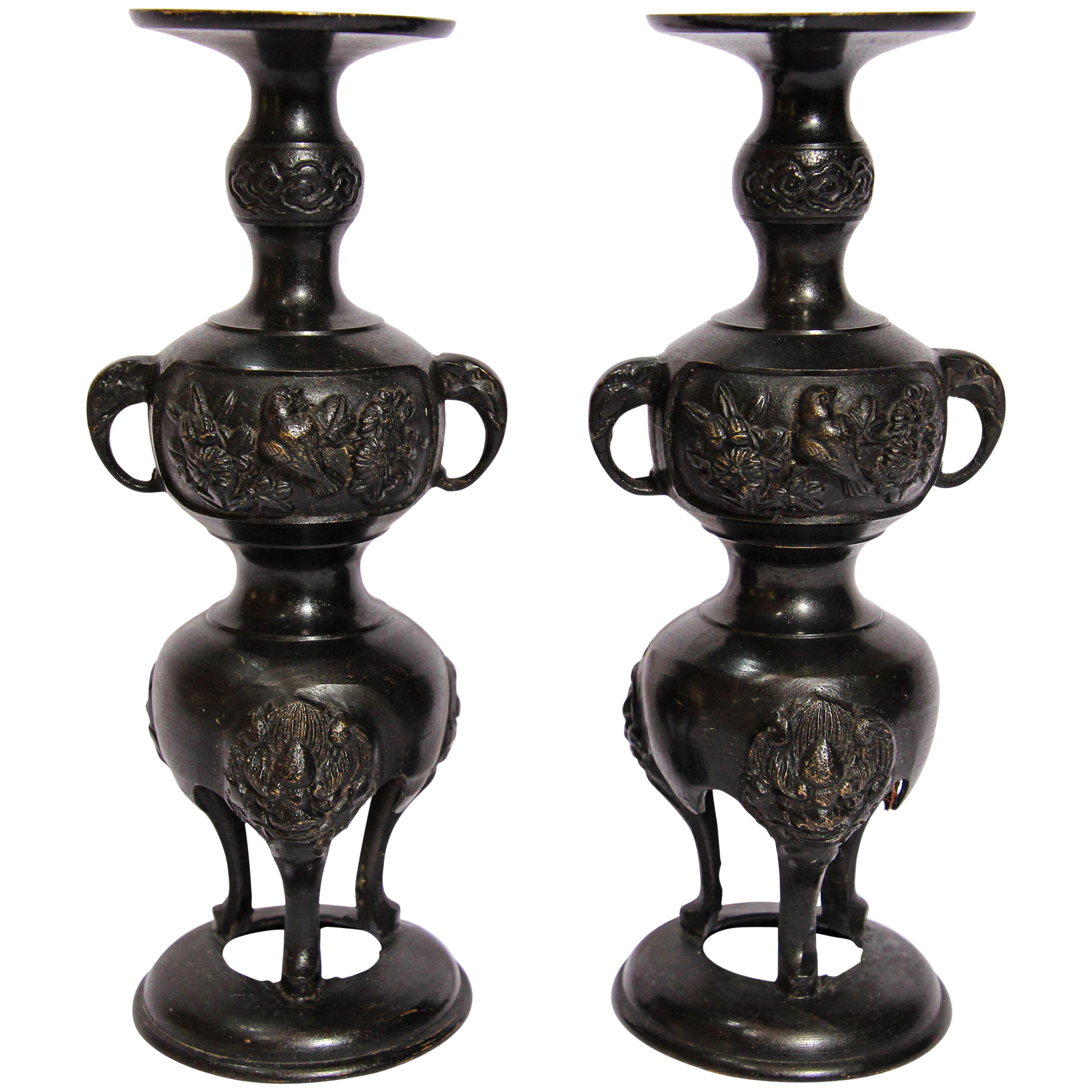 Pair Of Black Bronze Japanese Candleholders Incense Burner Chairish