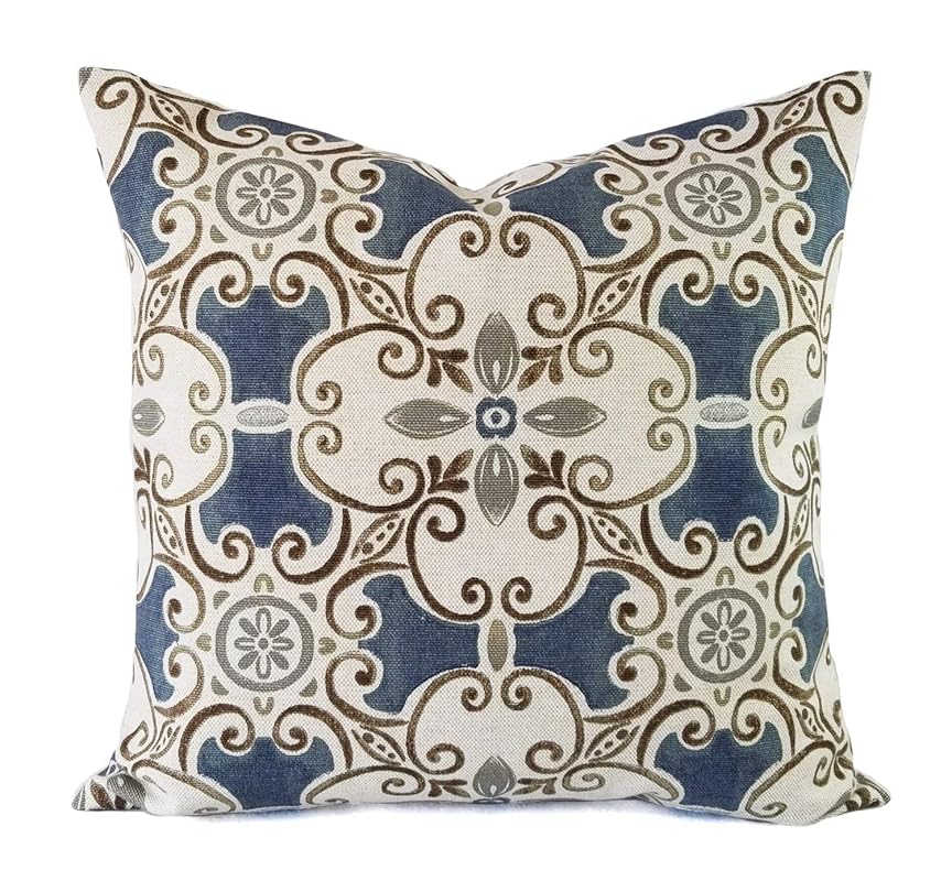 Linen Damask Print Blue Brown 18x18 Throw Pillow From Pillow Decor