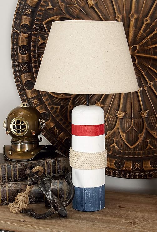 Benzara Stylish White Wooden Buoy Table Lamp With Red And Blue