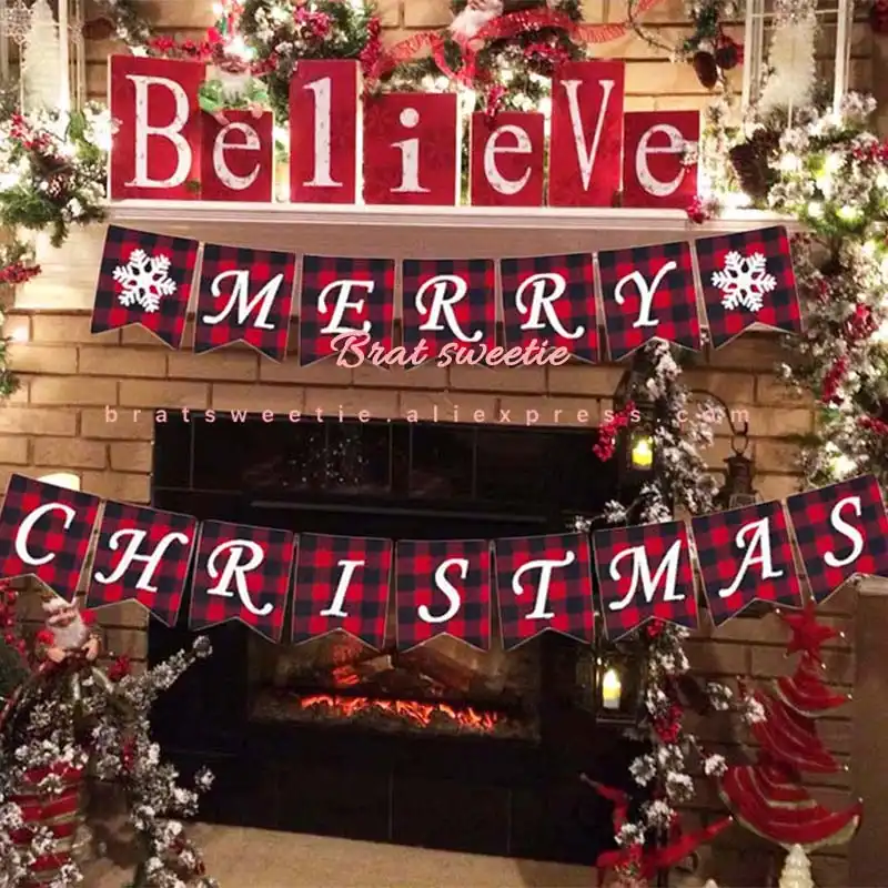 Buffalo Plaid Merry Christmas Banner Burlap Noel Flag Garlands