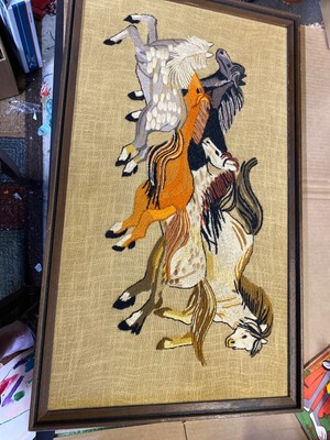 Vintage Yarn Art Large Mustangs Needlework Wild Horses Burlap