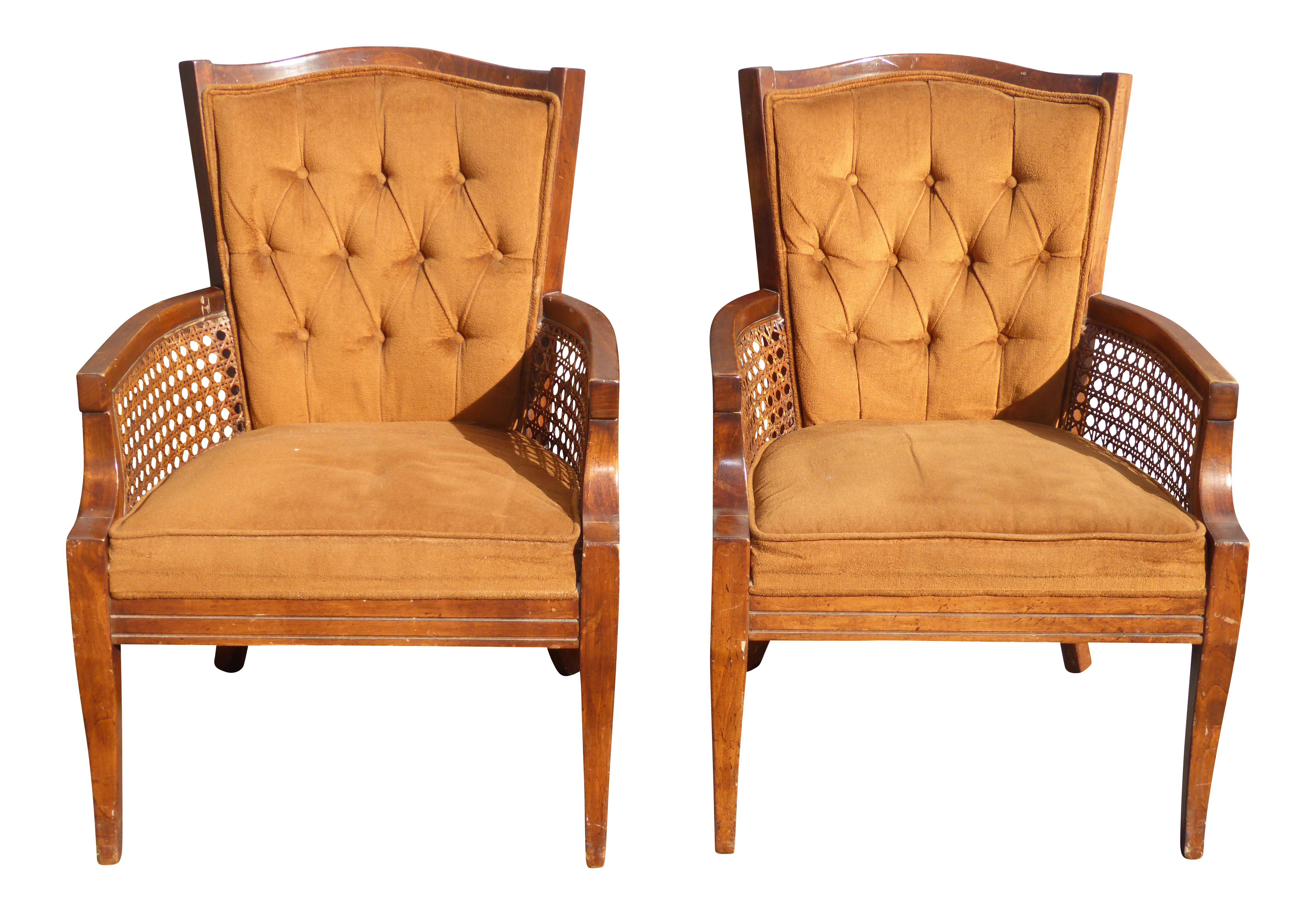 Pair Vintage Mid Century Burnt Orange Tufted Velvet Cane Accent