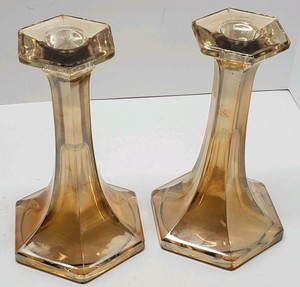 Vtg Orange Opalescent Iridescent Glass Candle Holder Set Retro