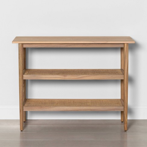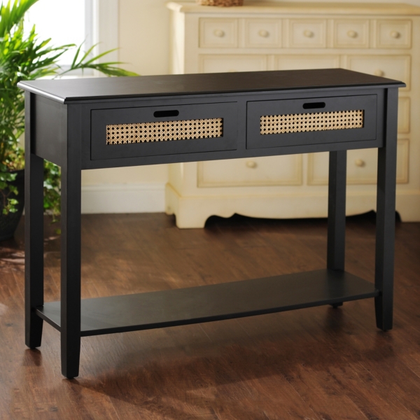 Cane console table. This decorative console table features a wooden frame with a rectangular tabletop and two lower shelves with cane detailing. This solid wood console table stands out with its distinctive form and beautiful hand distressed and polished mango wood construction. Picture frames a decorative bowl or a pair of table lamps will find a perfect home on this rustic console table. You have searched for cane console and this page displays the closest product matches we have for cane console to buy online.