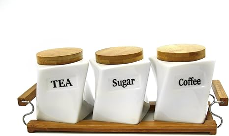 Set Of 3 Canister Set Tea Coffee Sugar White Square With Wooden Stand K O G Direct