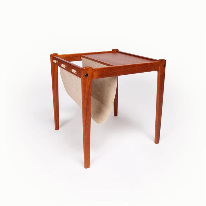 1960s Midcentury Vintage Teak Side Table Canvas Magazine Rack Brdr