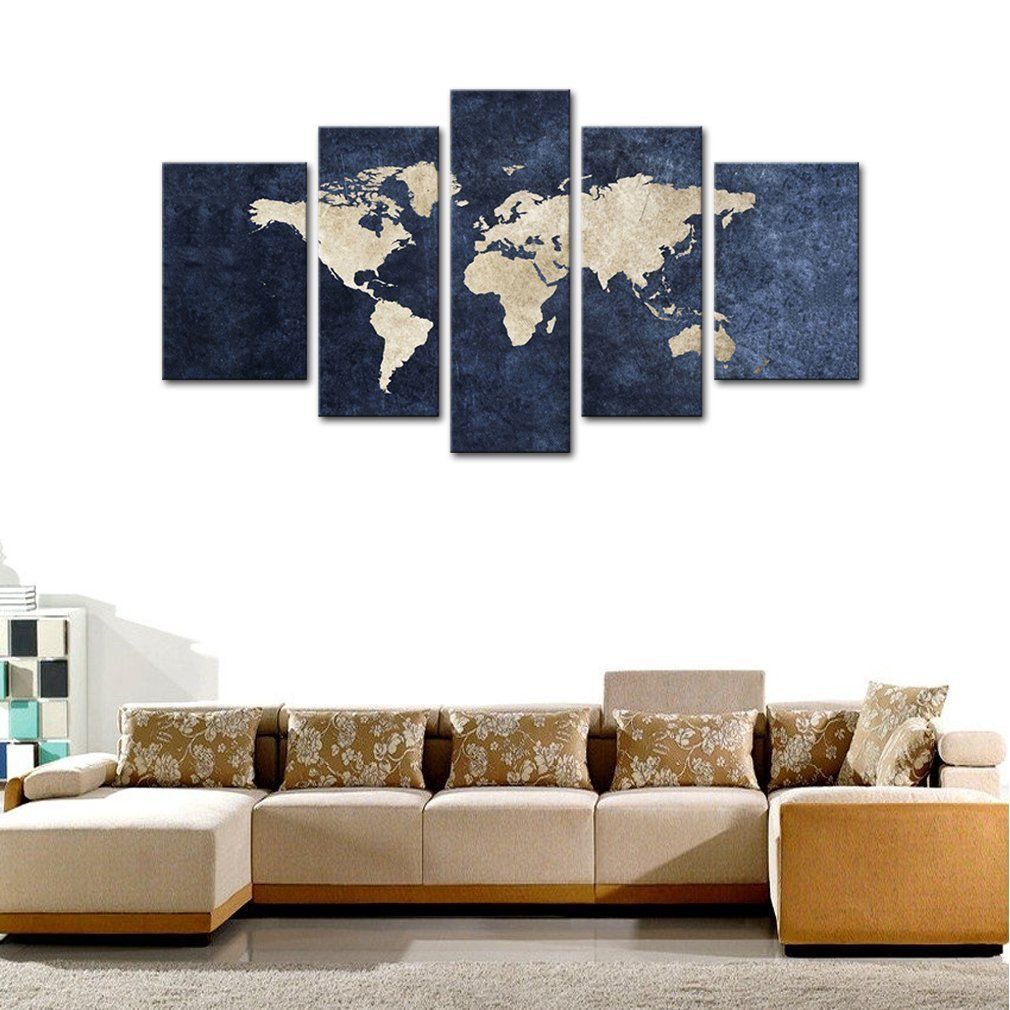 2020 5 Panels Canvas Wall Art Blue Map Painting World Map With