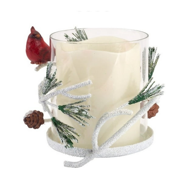 Cardinal Bird Pillar Candle Holder Christmas Holly Glitter Snow